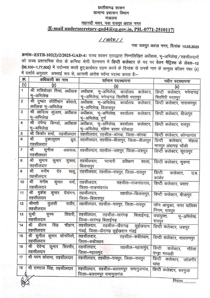 राज्य सरकार ने तहसीलदारों को डिप्टी कलेक्टर के पद पर प्रमोट किया है। कुछ को नई जगह पर पोस्टिंग भी मिली है। बस्तर में ड्यूटी कर रहे अधिकारियों को रायपुर ट्रांसफर किया गया है। आदेश के मुताबिक 18 तहसीलदारों को डिप्टी कलेक्टर बनाया गया है।