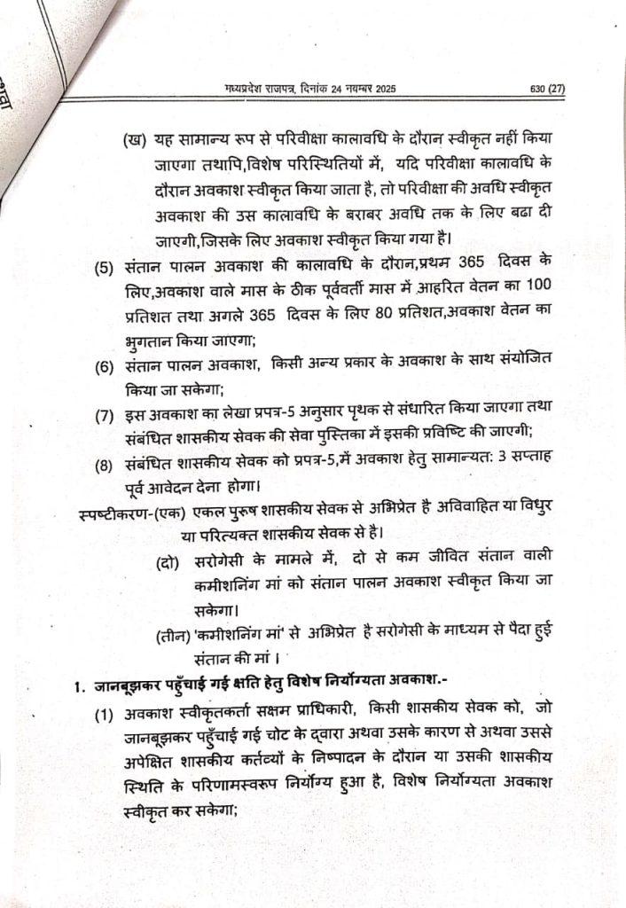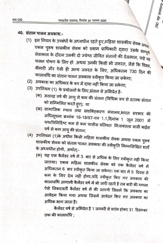 मध्यप्रदेश के लगभग 7 लाख सरकारी कर्मचारियों और अधिकारियों के अवकाश नियमों में बड़ा बदलाव किया गया है। वित्त विभाग ने मध्य प्रदेश सिविल सेवा अवकाश नियम 2025 का नोटिफिकेशन जारी कर दिया है, जो 1 जनवरी 2026 से प्रभावी होगा। नए नियमों के तहत कर्मचारियों के चाइल्ड केयर लीव (संतान पालन अवकाश) में बदलाव किया गया है।