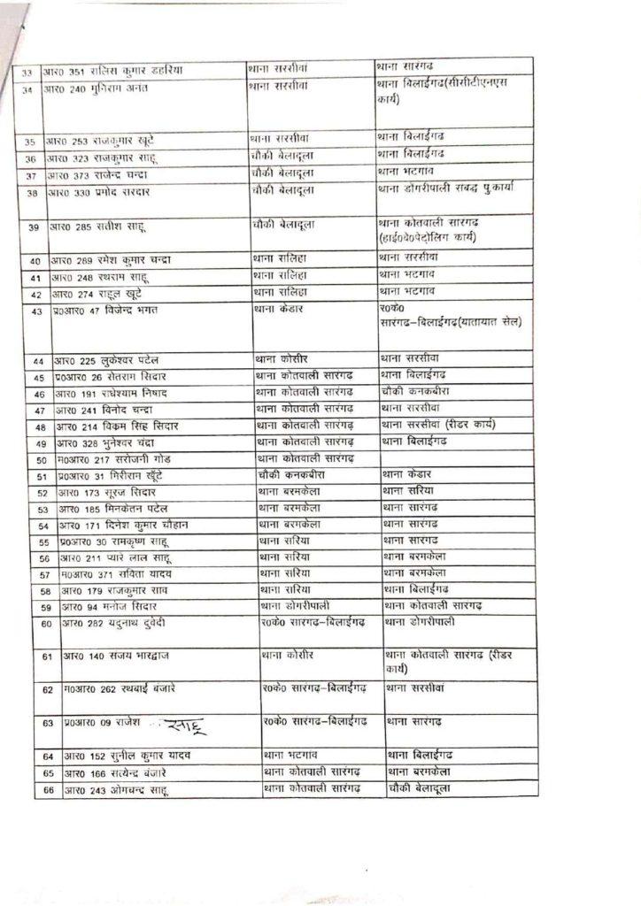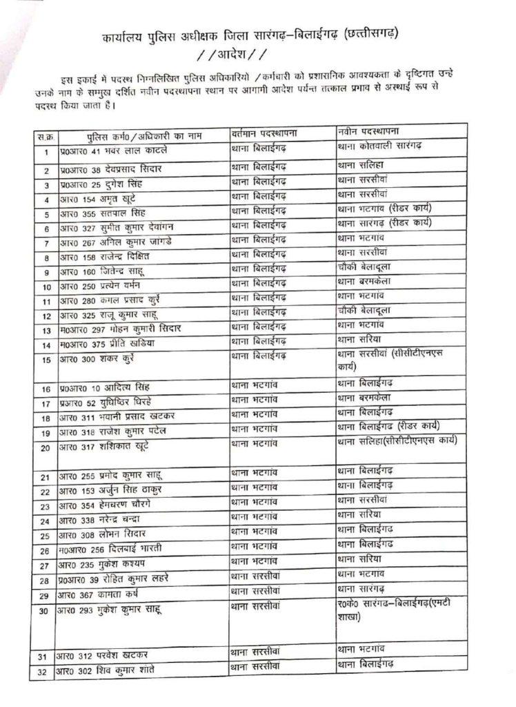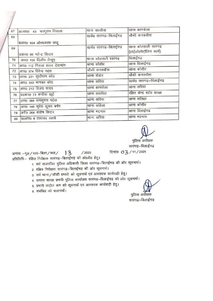 सारंगढ़–बिलाईगढ़ जिले के पुलिस विभाग में एक बार फिर बड़े पैमाने पर तबादले किए गए हैं। पुलिस अधीक्षक कार्यालय से जारी आदेश के अनुसार कुल 80 पुलिस कर्मियों का स्थानांतरण किया गया है।
