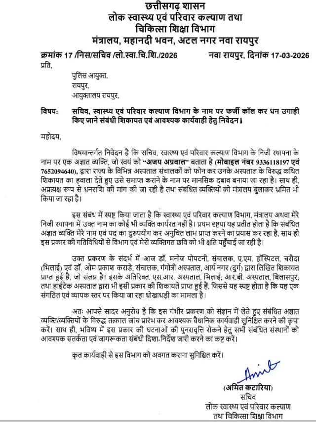 रायपुर में स्वास्थ्य विभाग के सचिव के नाम पर फर्जी कॉल कर अस्पताल संचालकों से अवैध वसूली की जा रही है। कॉल करने वाला खुद को “अजय अग्रवाल” बताकर अस्पताल संचालकों पर दबाव डाल रहा है और शिकायत खत्म करने के नाम पर रकम मांग रहा है।