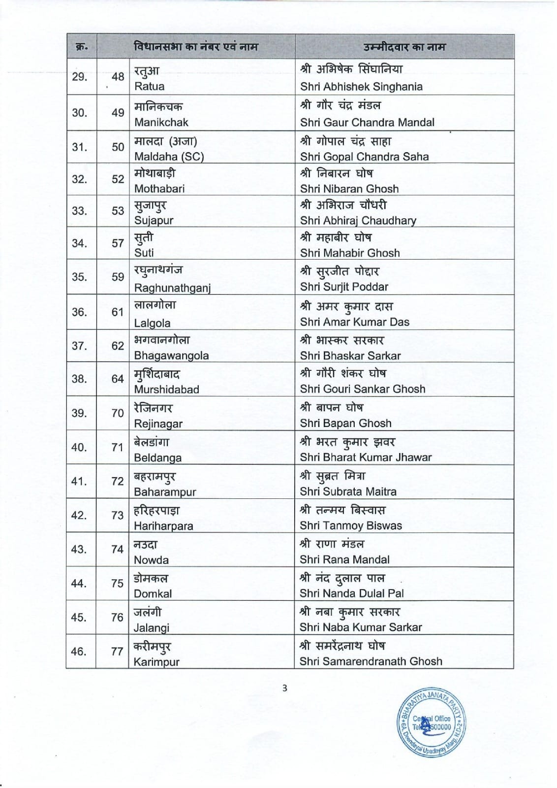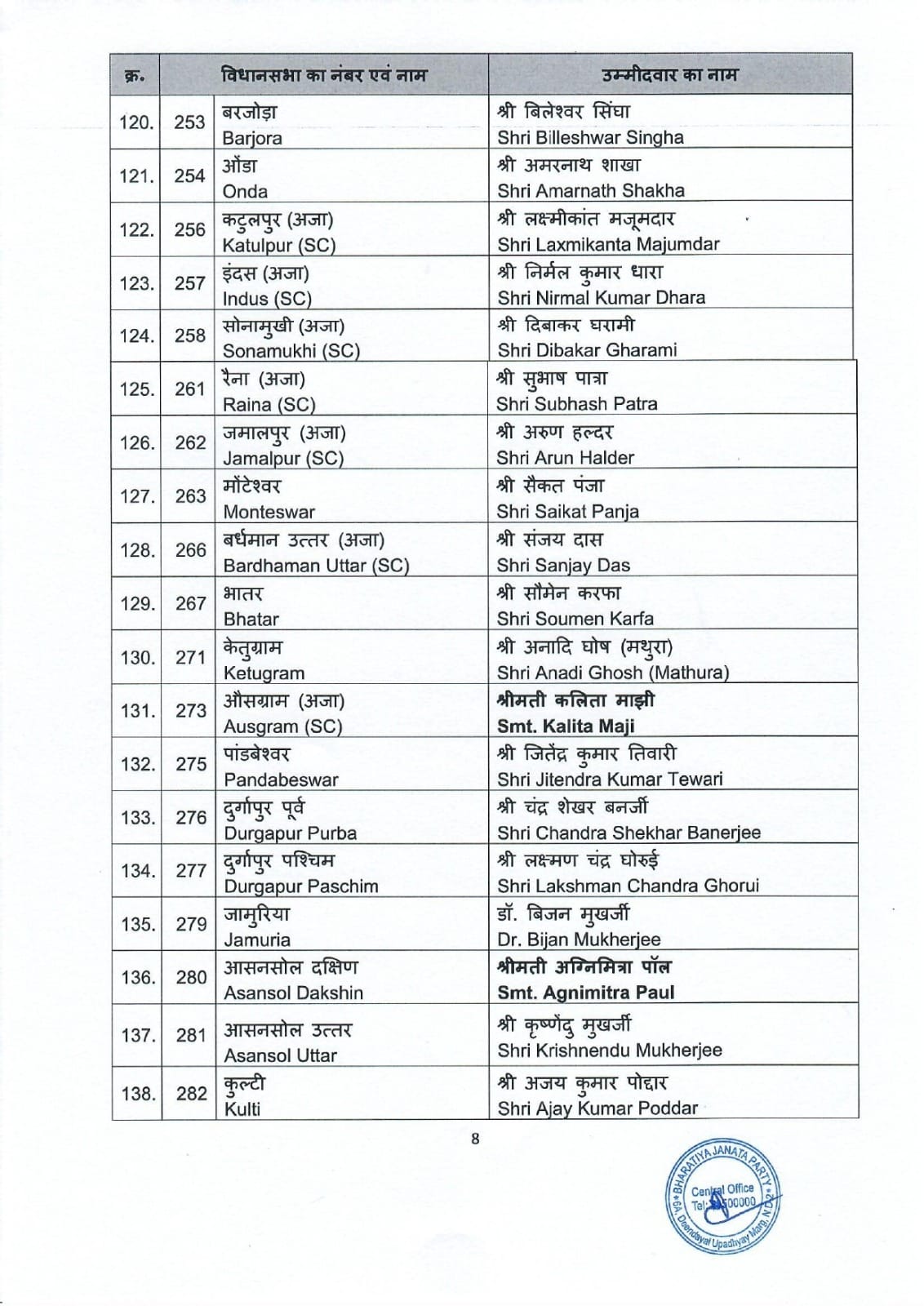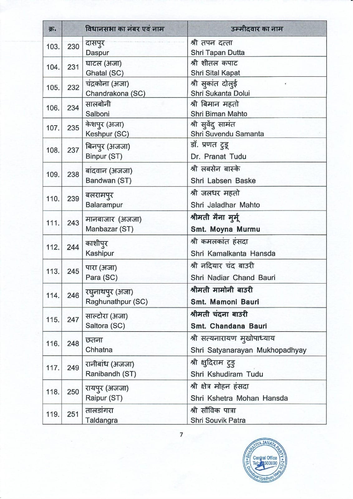 भाजपा की इस सूची में 11 महिला उम्मीदवारों को भी जगह दी गई है। इनमें प्रमुख नामों में अग्निमित्रा पॉल, कलिता मांझी (ओसग्राम), मैना मुर्मू (मान बाजार), मामोनी बाउरी (रघुनाथपुर) और चंदना बाउरी (साल्टोरा) शामिल हैं।