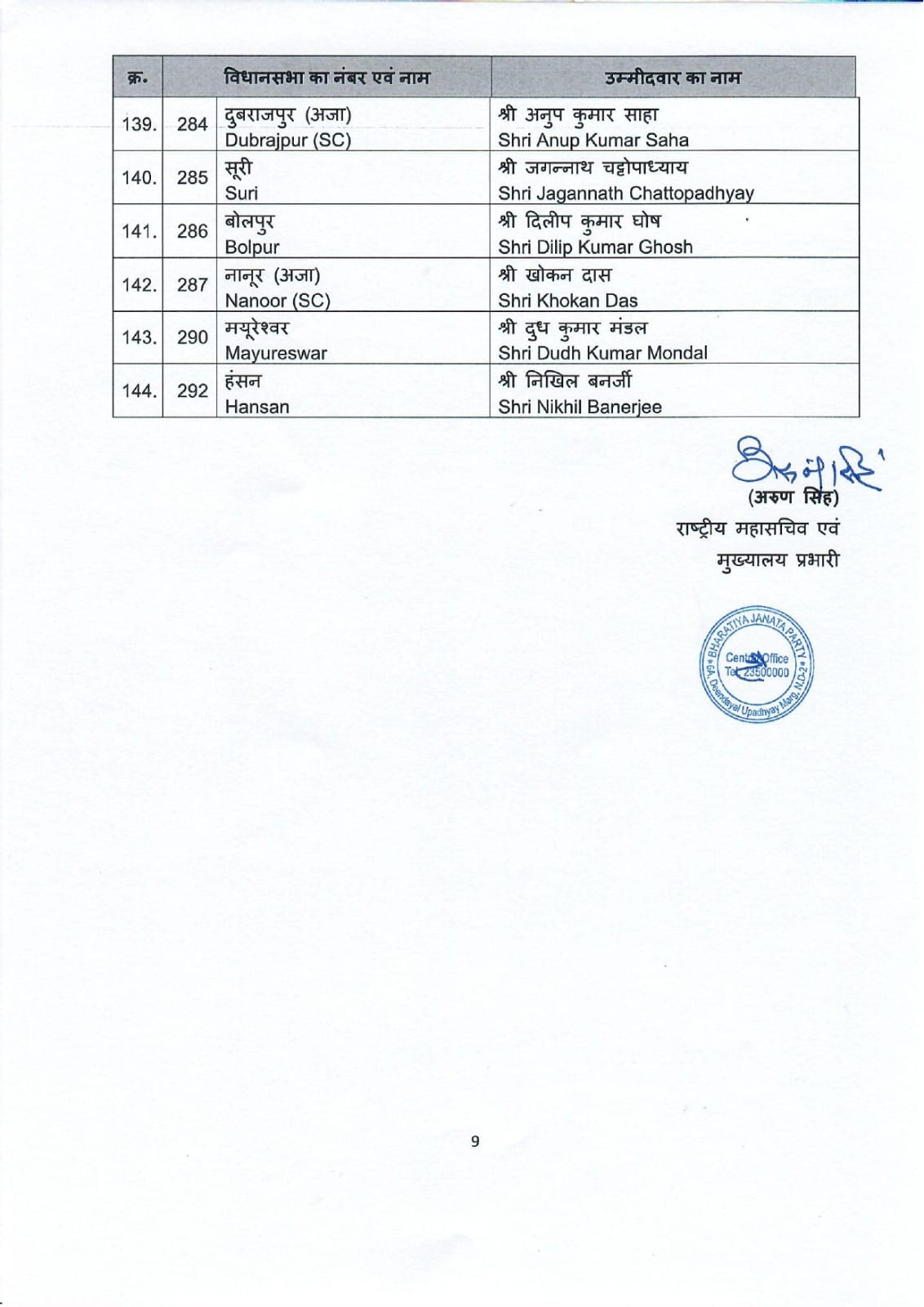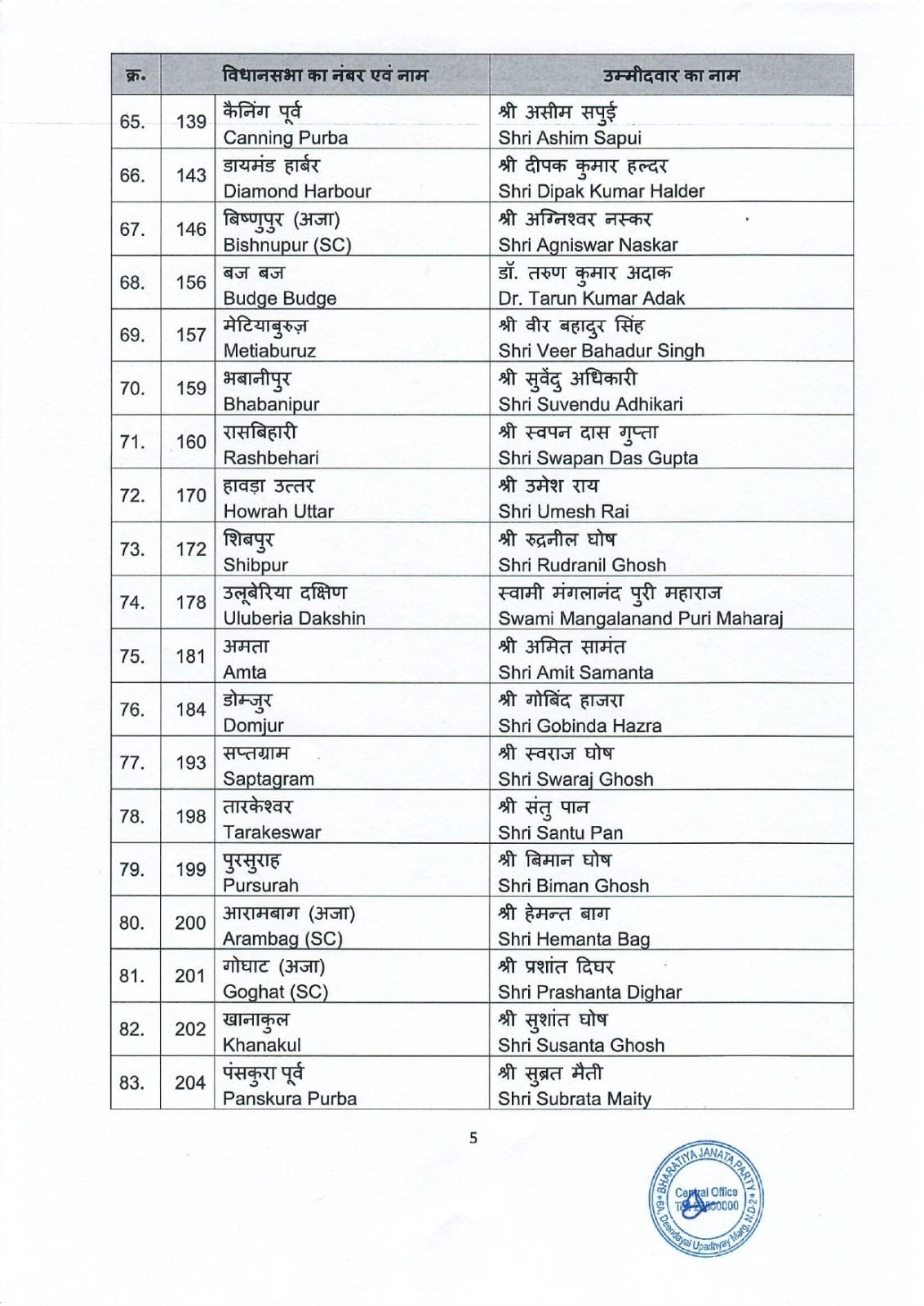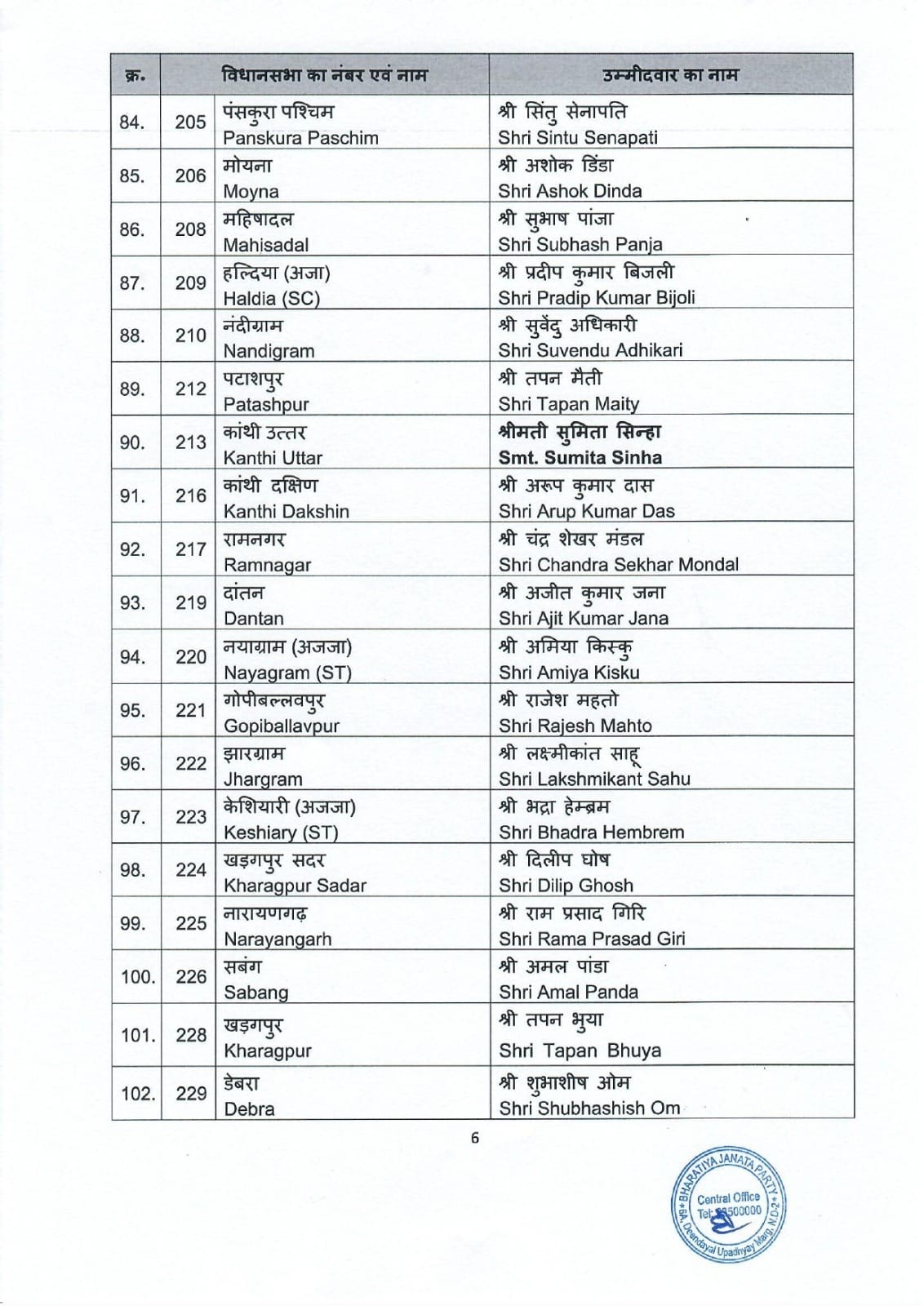 पश्चिम बंगाल विधानसभा चुनाव को लेकर भारतीय जनता पार्टी ने 144 उम्मीदवारों की अपनी पहली सूची जारी कर दी है। इस सूची में पार्टी ने कई प्रमुख नेताओं को टिकट दिया है। खास बात यह है कि वरिष्ठ नेता शुभेंदु अधिकारी को दो सीटों नंदीग्राम और भवानीपुर से उम्मीदवार बनाया गया है। वहीं, भाजपा नेता दिलीप घोष को खड़गपुर सदर विधानसभा सीट से टिकट दिया गया है।